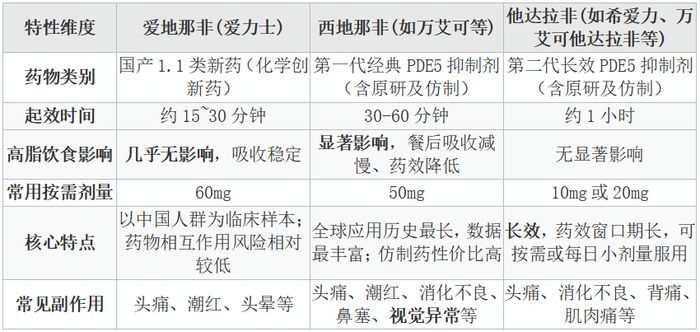 下表汇总了爱地那非、西地那非、他达拉非三种药物的核心特性。所有数据均基于药品说明书、审评报告及临床研究,是客观比较的基础。